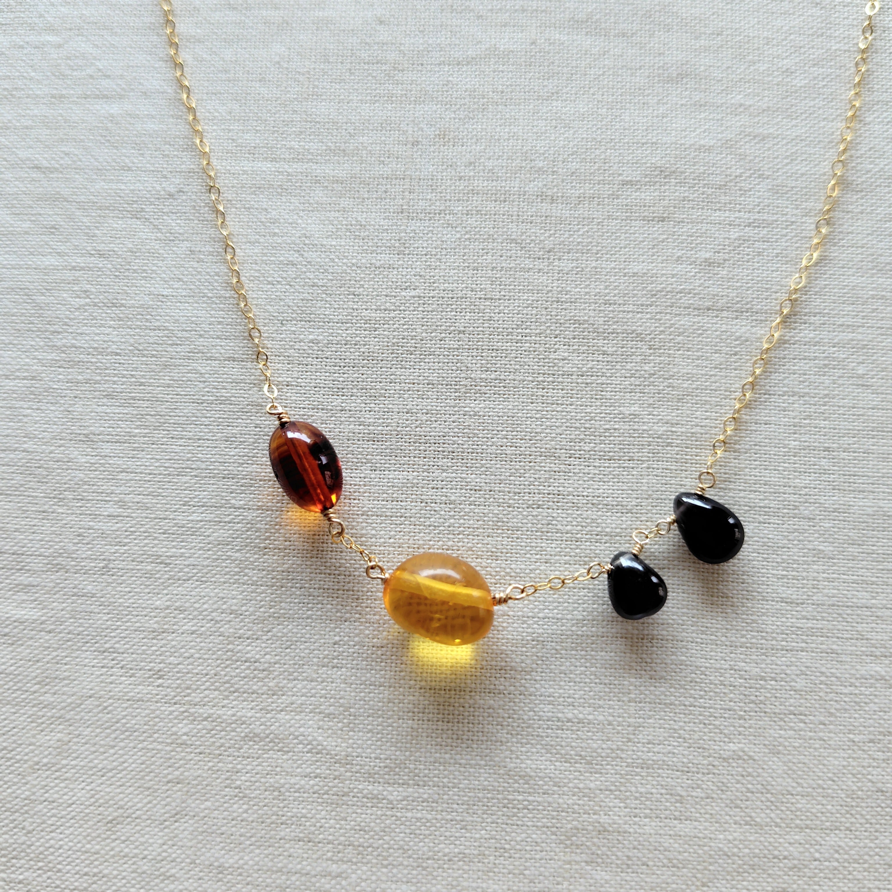 おうごんの実/2色の琥珀とシリマナイトのネックレス