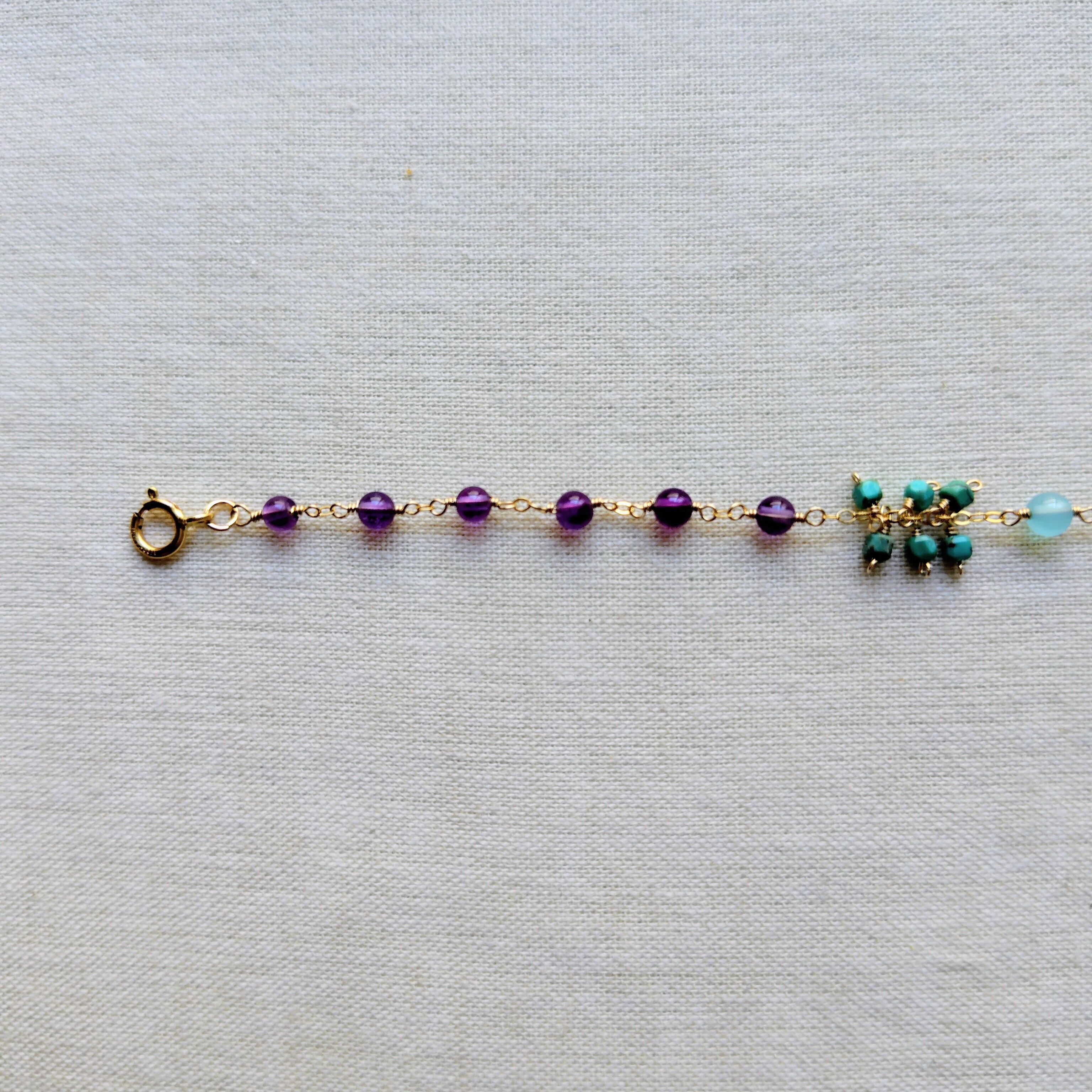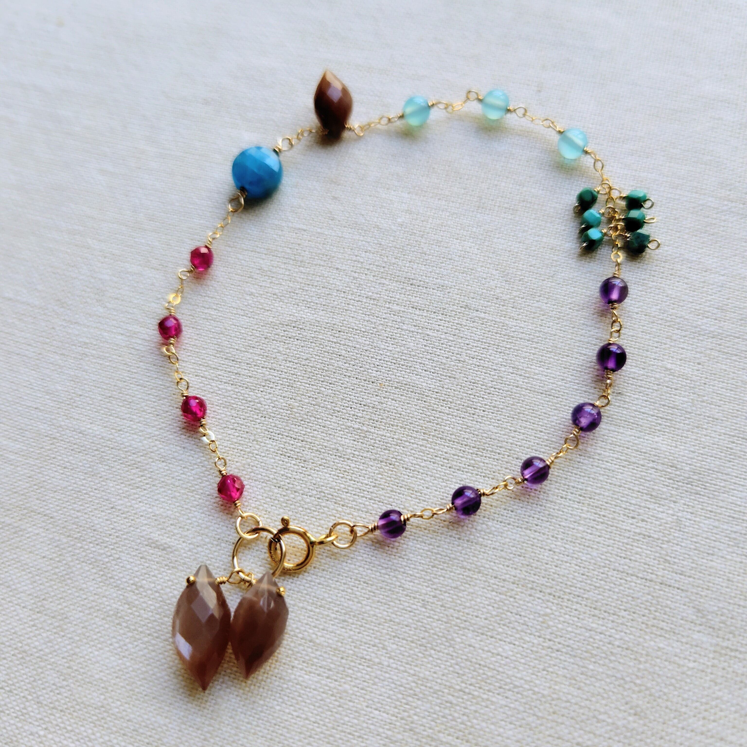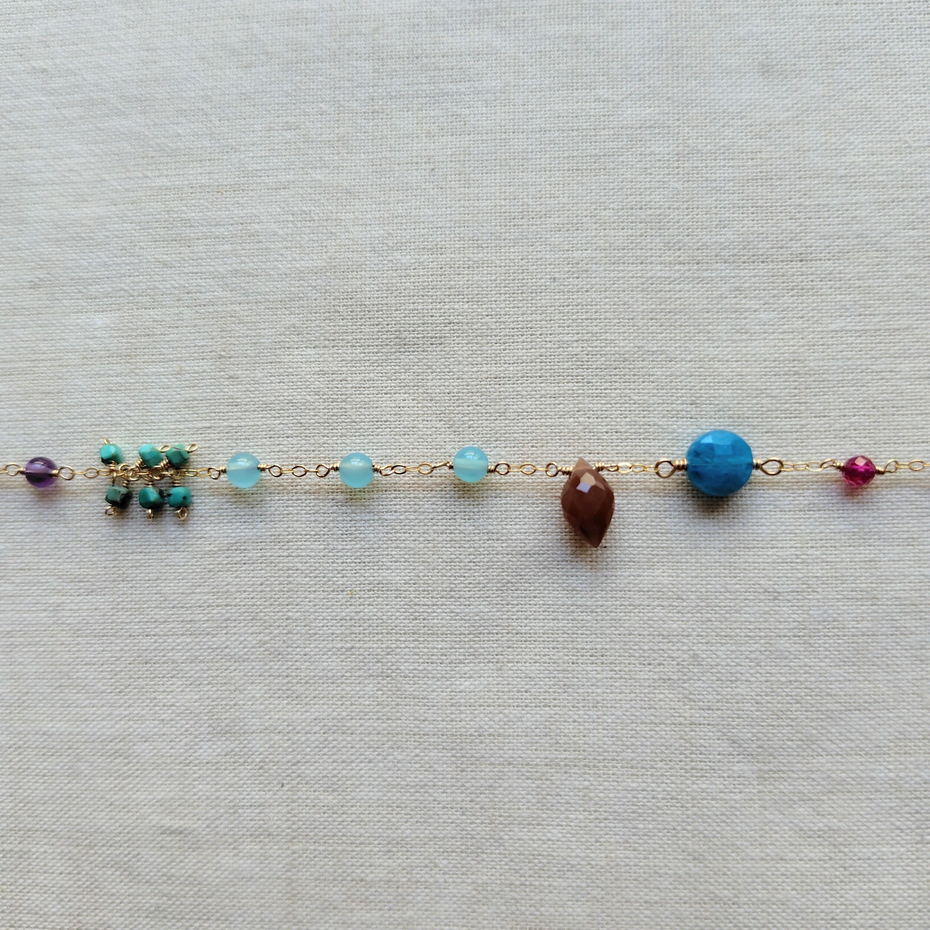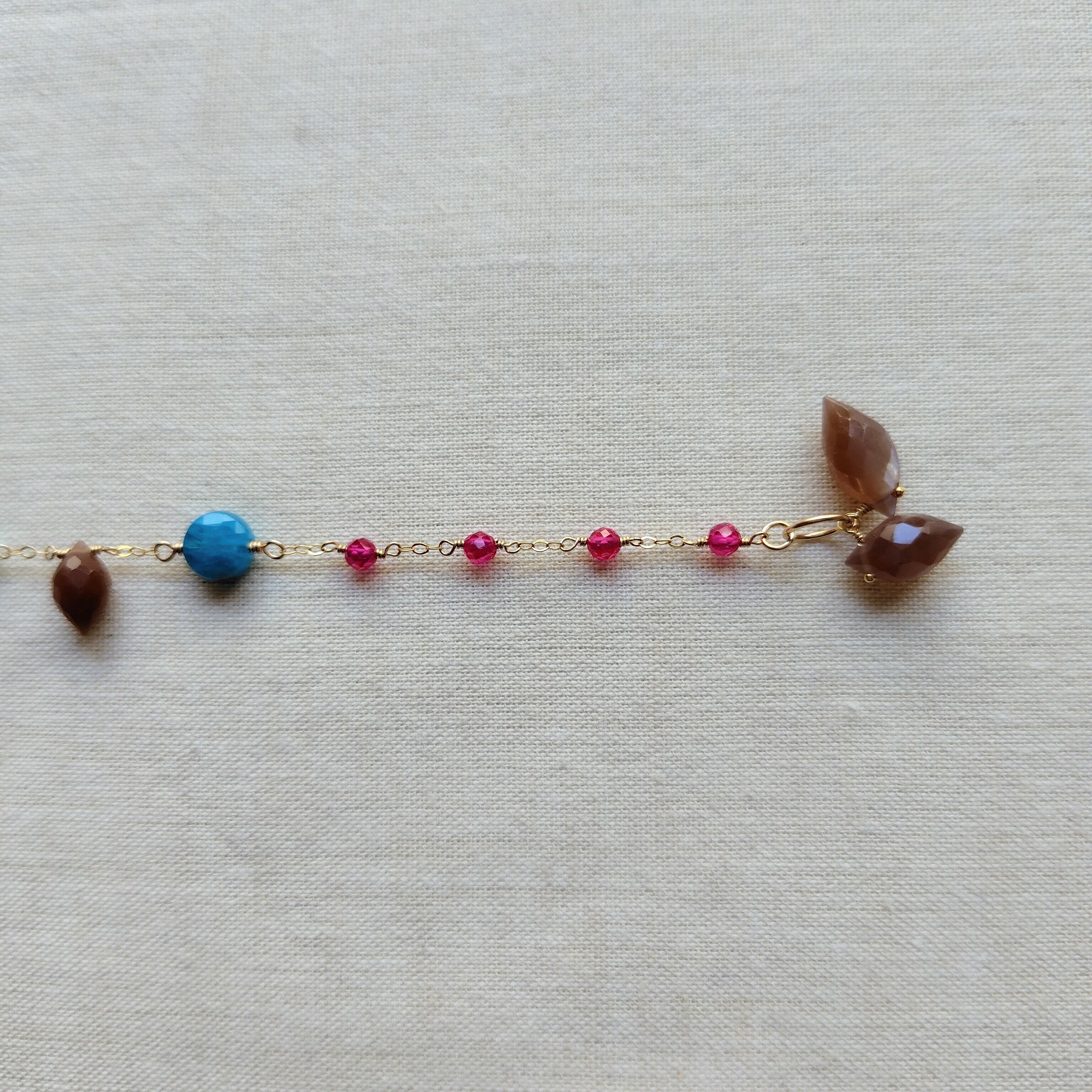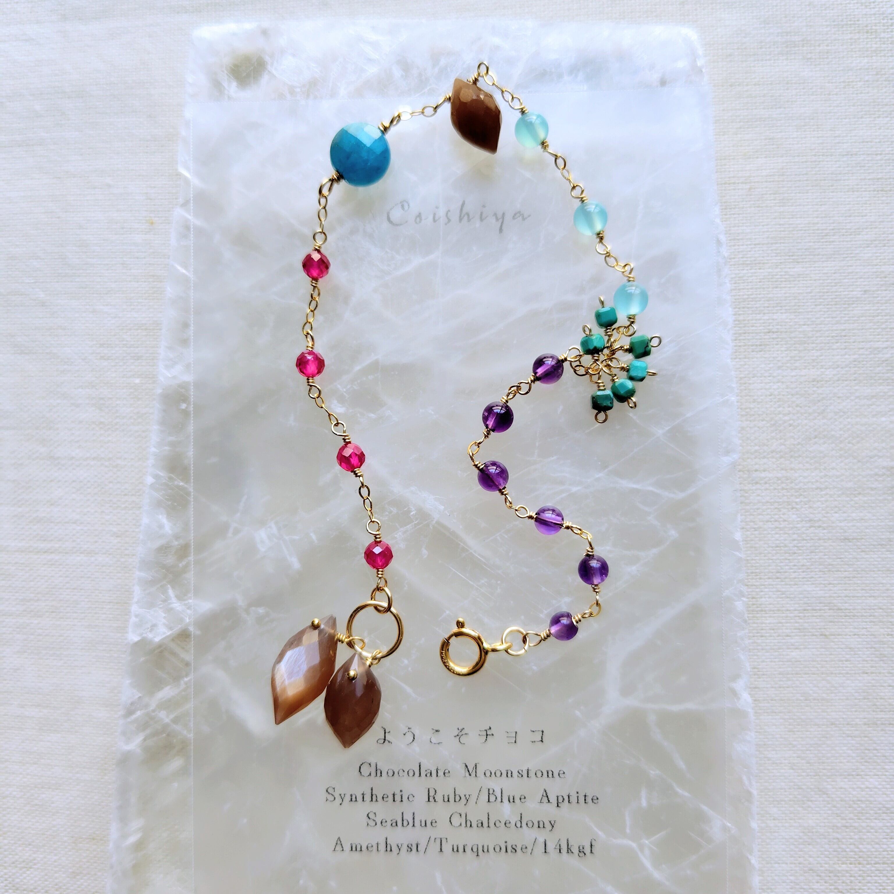 素 材/14kgf、チョコレートムーンストーン、アメジスト、ターコイズ、シーブルーカルセドニー、ブルーアパタイト、シンセティック(合成)ルビー