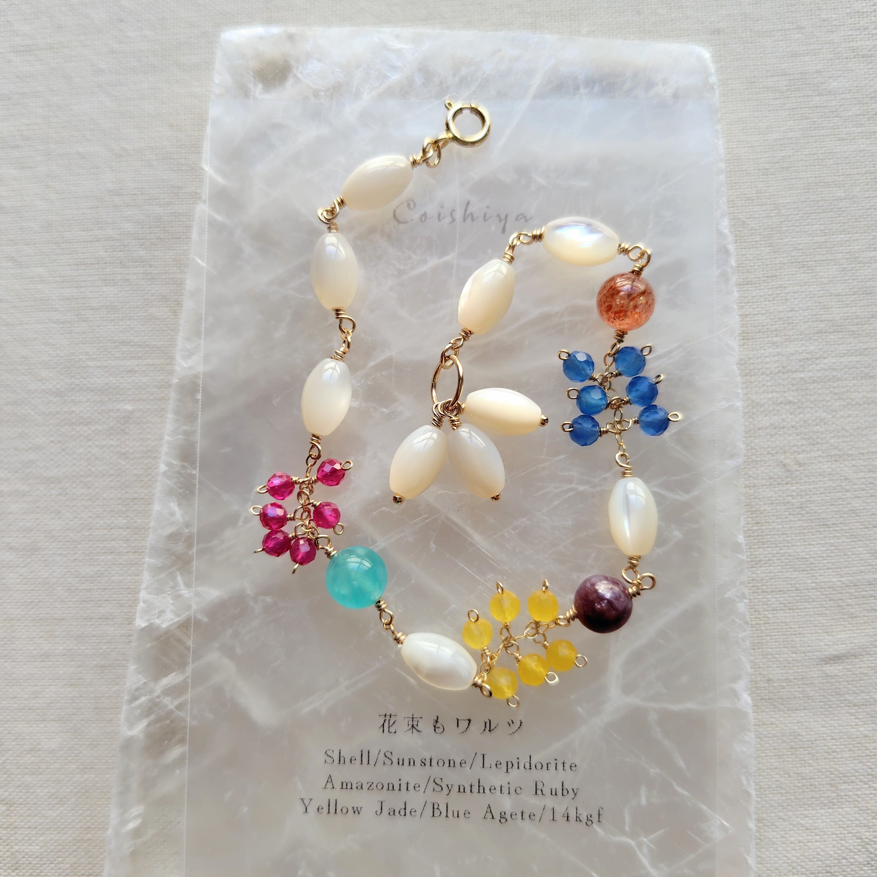 素 材/14kgf、白蝶貝、サンストーン、レピドライト、アマゾナイトシリカ、ブルーアゲート、イエロージェード、シンセティック(合成)ルビー