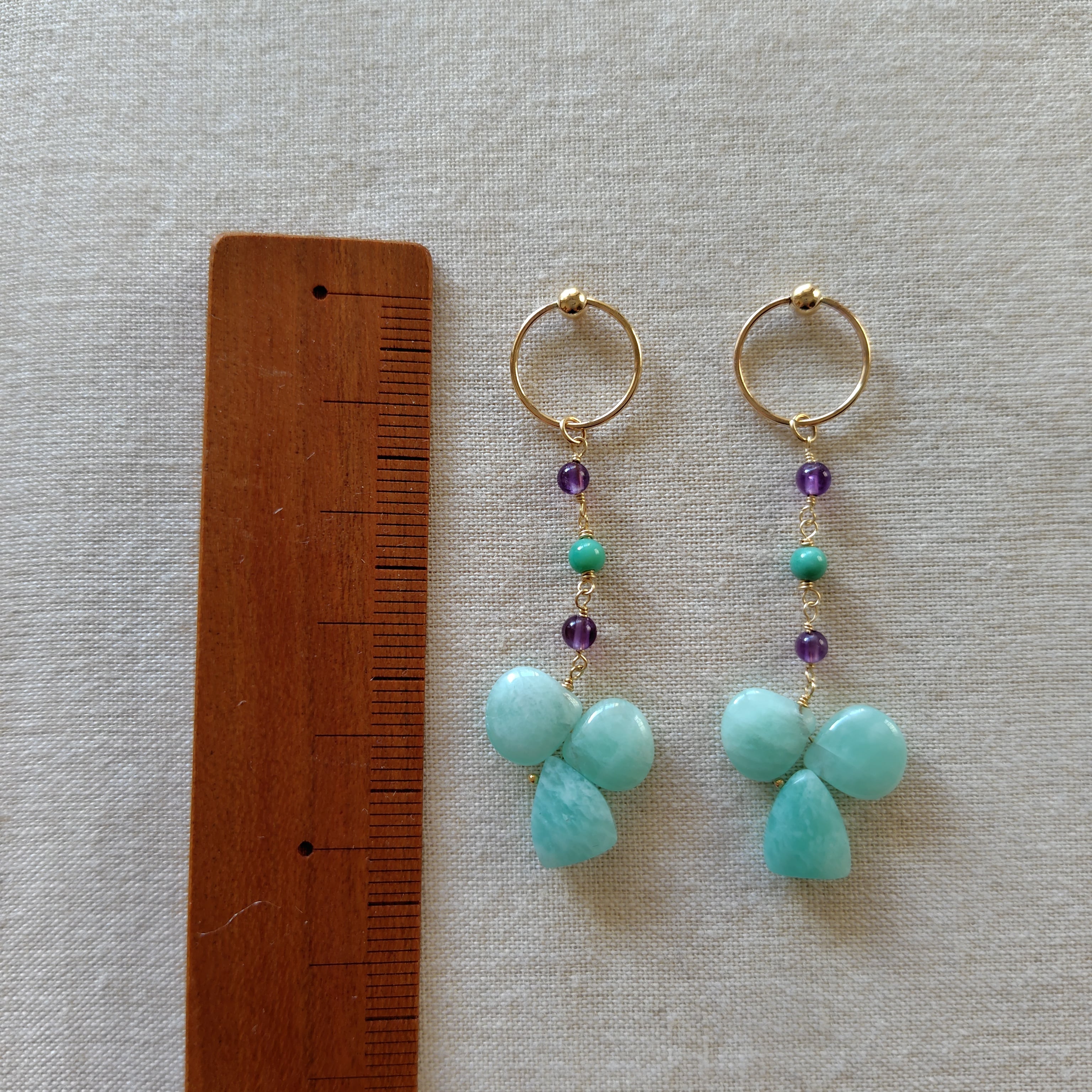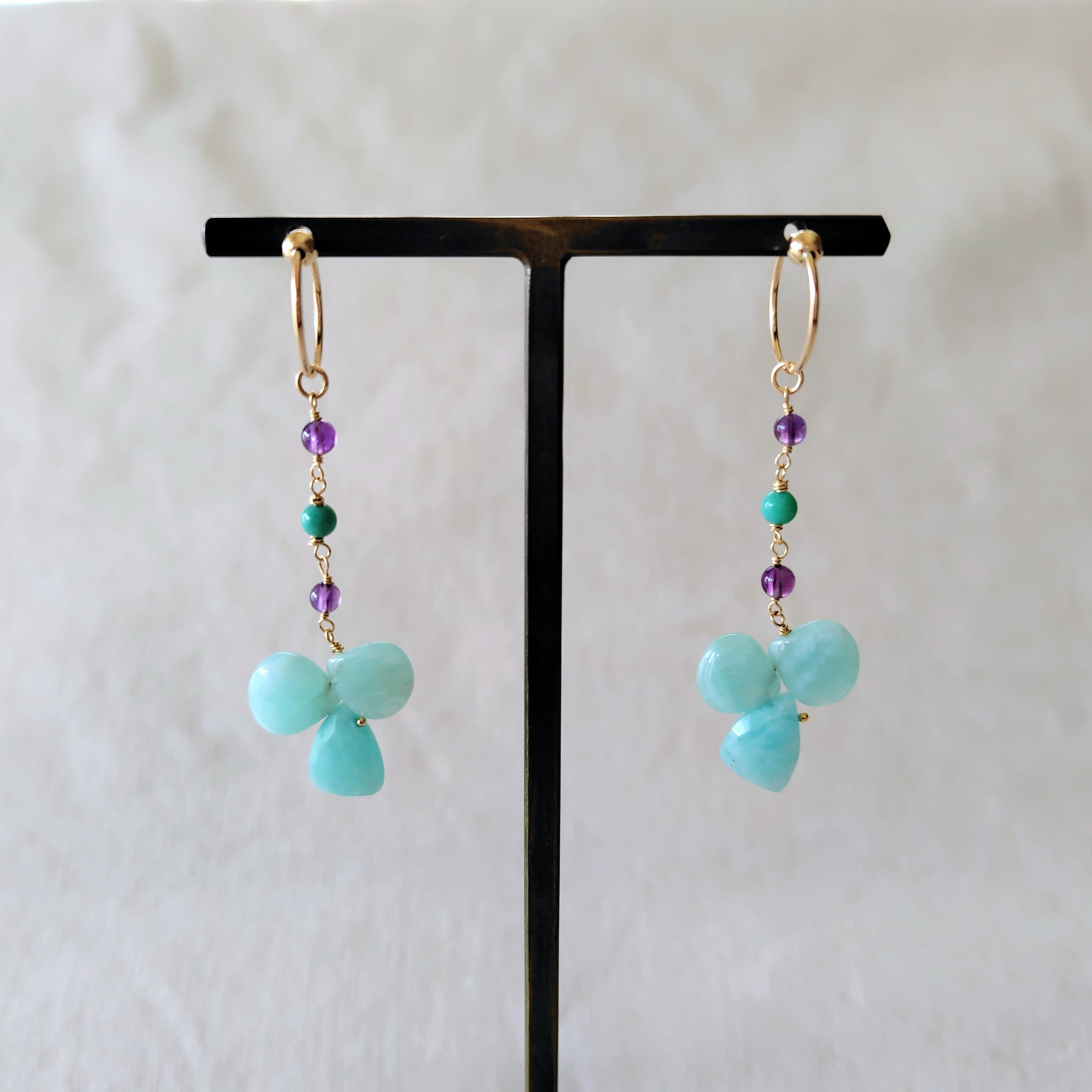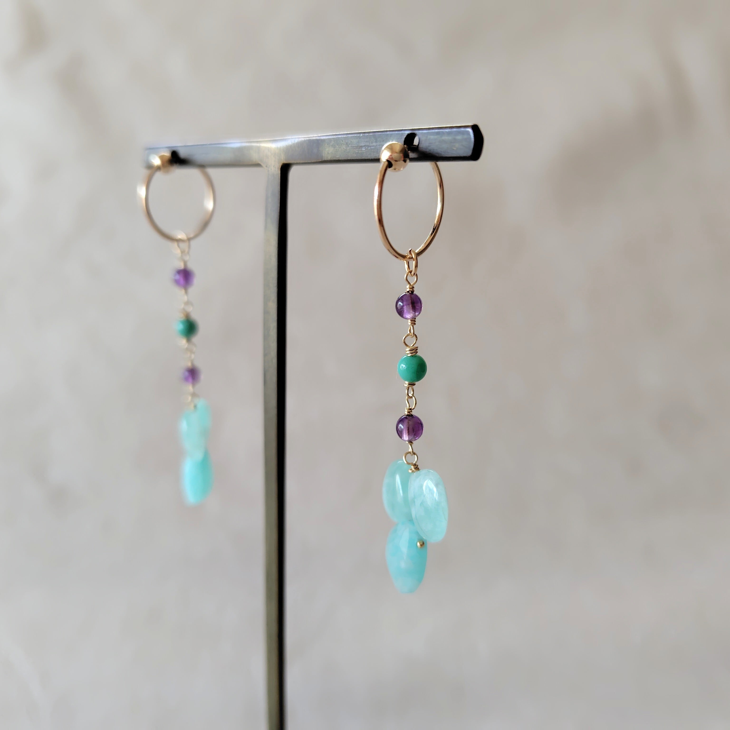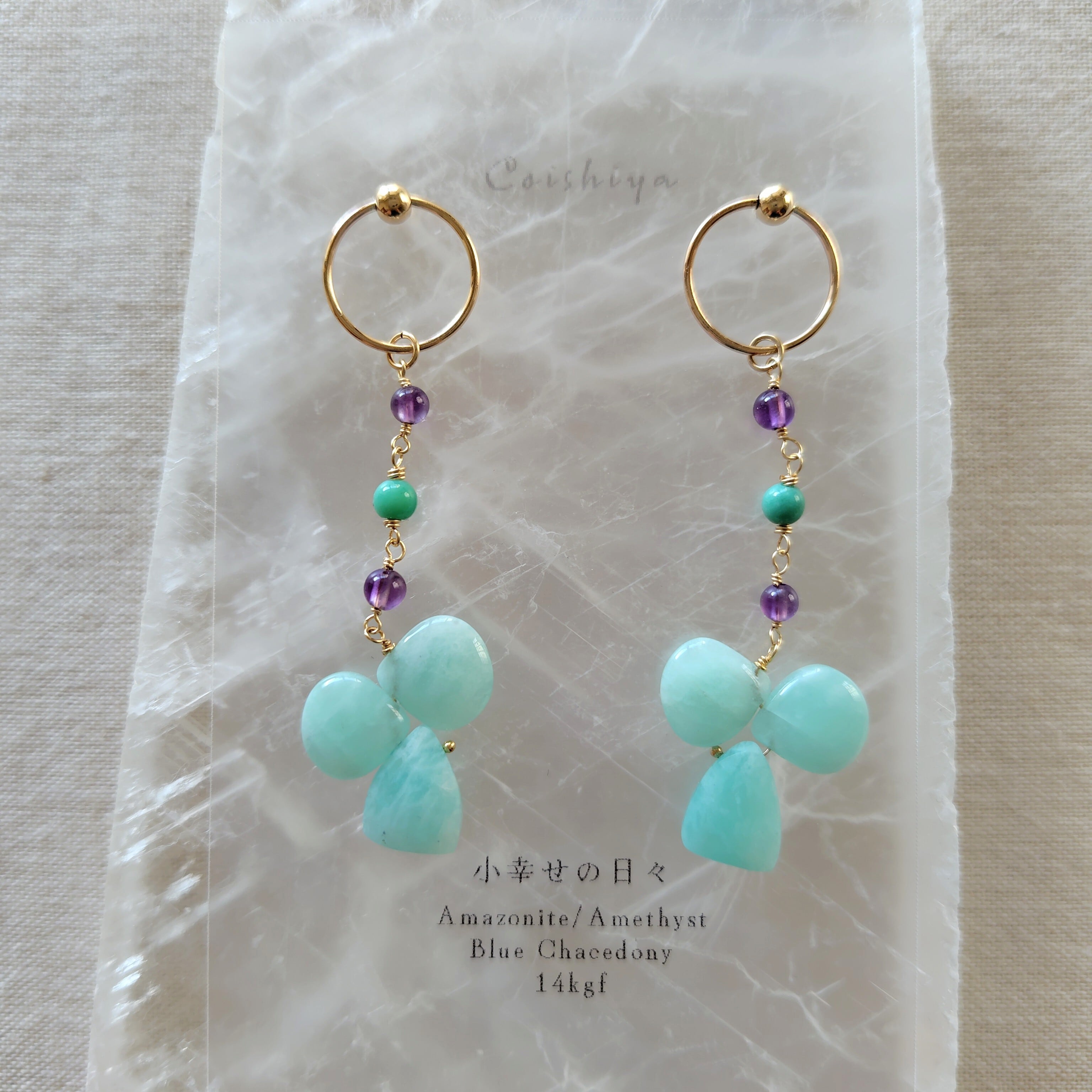 小幸せの日々/アマゾナイト・アメジスト・天然ブルーカルセドニーのフープ耳飾り