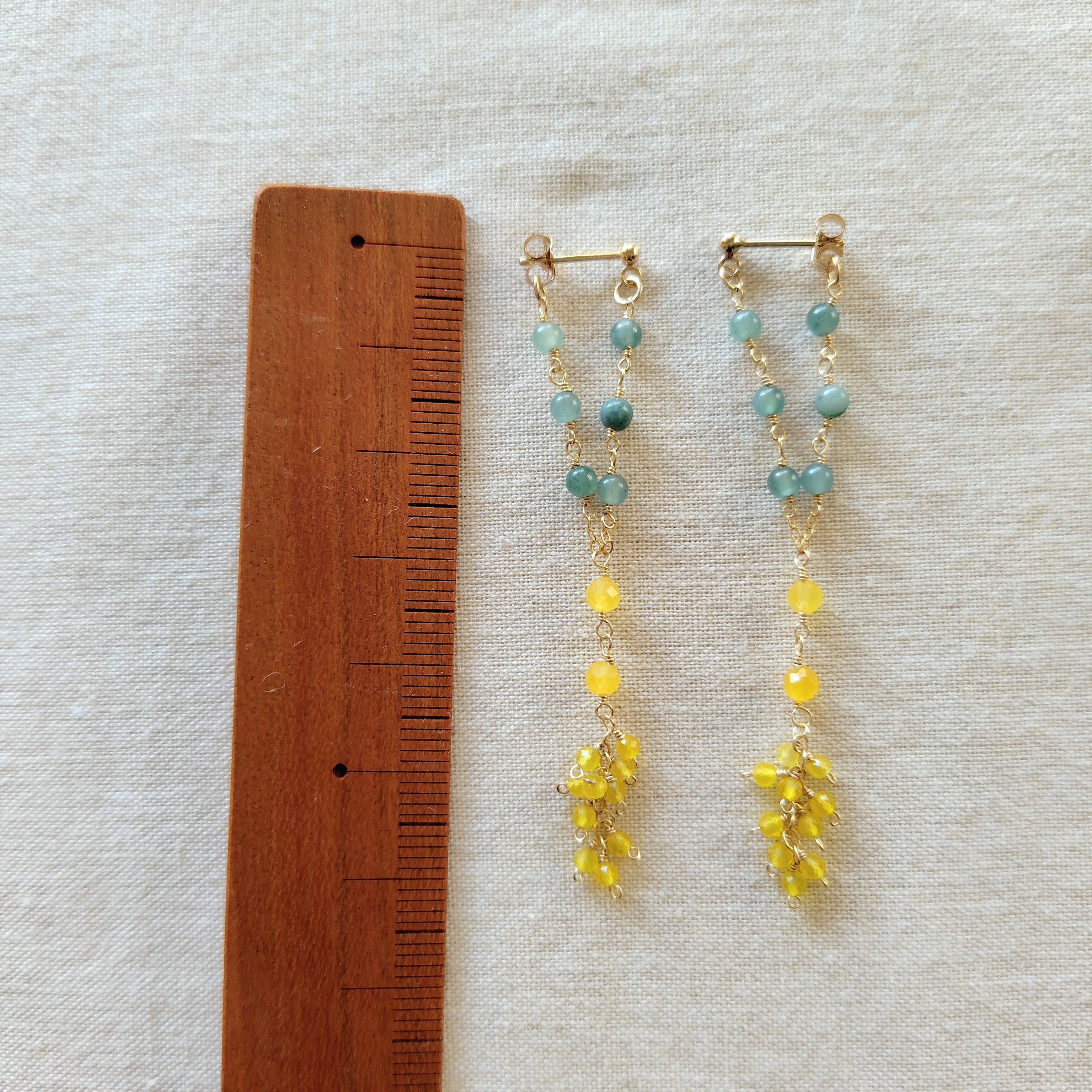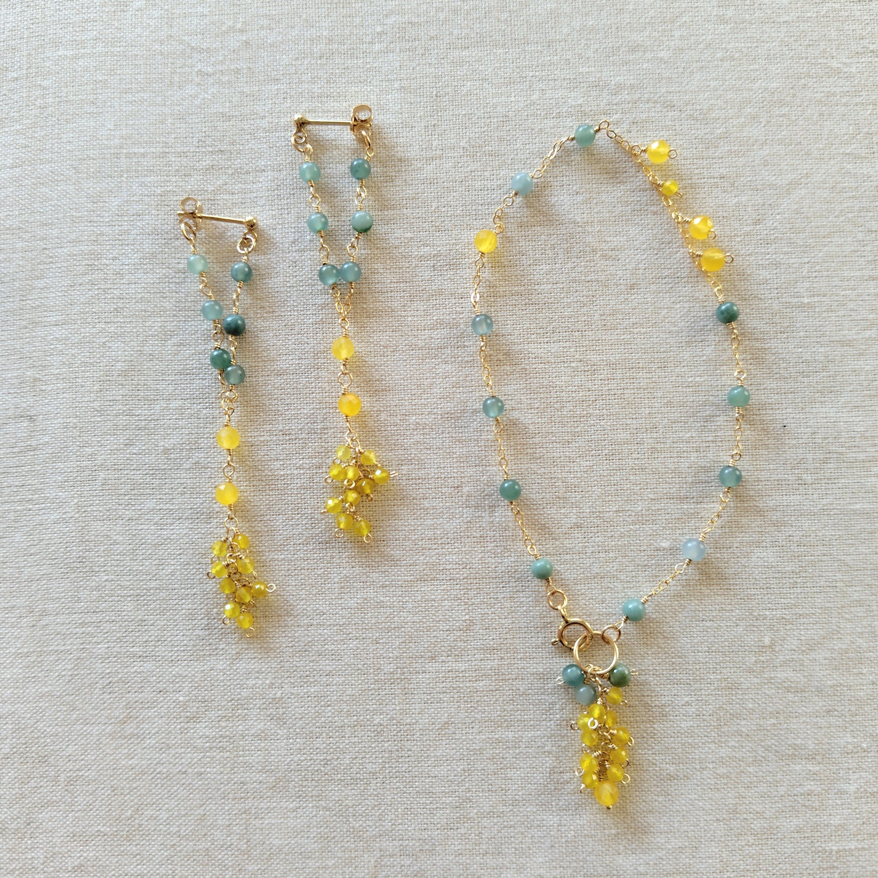 明るいイエローが可愛いジェード(クォーツァイト)と、とろみのある優しいグリーンのグアテマラ翡翠で、ミモザの耳飾りを…